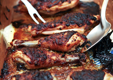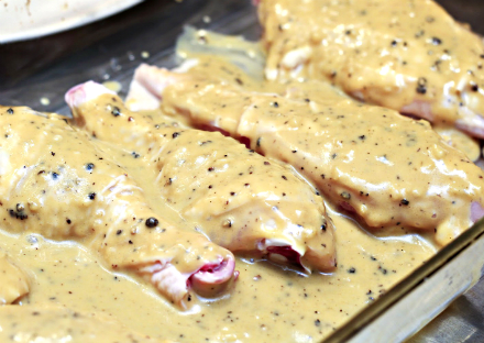 Sauce:½ cup Dijon mustard 2 tablespoons soy sauce 3 crushed garlic cloves ½ cup olive oil juice of one lemon pepper 1. Preheat oven to 350. 2. Mix all of the ingredients for the sauce in a bowl until combined and thickened. 3. Dry off chicken parts and lay in a baking dish so that each piece has a little room around it. (Overcrowding will lead to uneven cooking.) 4. Spoon the sauce over the chicken to cover and bake for one hour.