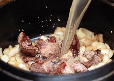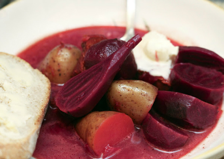 Borscht(serves 4-6) Note: The meat in this dish is totally optional. This would be a perfectly flavorful vegetarian soup, as well! 1 lb. cubed beef 8 cups of chicken stock or water 2 tablespoons of olive oil or lard 1 large onion, finely chopped 1 bay leaf 3 medium sized beets, cubed 1" 3 medium sized carrots, cubed 1" 3 medium potato (like Yukon gold), cubed 1" salt 1 tablespoon creme fraiche or sour cream (per bowl) 1 sprig of parsley or dill 1. Pat the cubed beef dry, and salt heavily. 2. Place a large heavy pot or dutch oven on high heat. With the lard or oil, brown the beef in batches. Set aside. 3. Lower heat to medium-high and cook the onions. When they begin to soften and become translucent, add the beef back along with the stock or water and bay leaf. 4. Bring to boil, then turn down to a simmer and cover for 45 minutes. 5. After 45 minutes add beets. Bring to a boil again, and turn down to a simmer. 6. After another 15 minutes, add the carrots and potatoes. Let cook for another half hour, or until a fork goes through the potatoes. 7. Serve with a dollop of creme fraiche and a sprig of parsley or dill in each bowl.