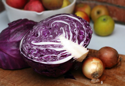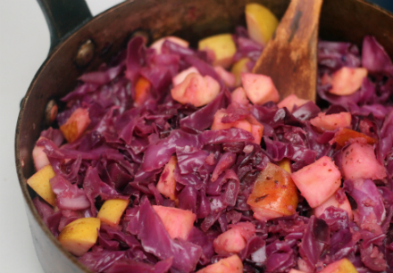 Braised Red Cabbage with Apple 2 tablespoons butter 1 tablespoon olive oil 2 medium onions, halved and thinly sliced 4 crisp tart apples, halved, cored, and cut into chunks 1 head red cabbage (2 pounds), cored, quartered, and thinly sliced Coarse salt and ground pepper 3 tablespoons cider vinegar 3 teaspoons cider 1 ½ tablespoon coarse spicy mustard (German style) 1. In a large heavy pot or sauté pan, melt the butter over medium heat. 2. Add the onion and cook, stirring occasionally, until softened, 4 to 6 minutes. 3. Stir in red cabbage and season with coarse salt and ground pepper. Wisk cider vinegar, cider and mustard together until combined, then add to cabbage and onion mixture. 4. Cook until cabbage is tender, stirring occasionally, about 20 minutes. 5. Add apples and cook another 15 minutes. Season again with salt and pepper to taste and serve immediately.