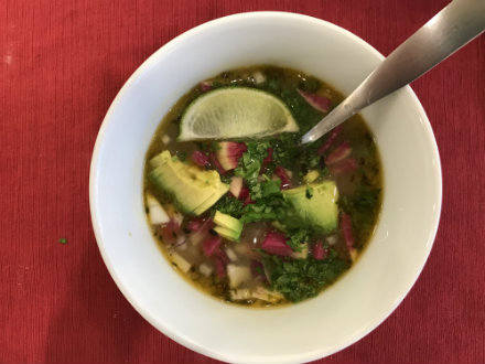 When the weather is so variable, a recipe like this for chicken posole, a Mexican stew, hits the spot: it's both light and warming. The subtle spice and layers of herbs compel us to dream of fresh cut oregano soon to come, while waving a thankful goodbye to winter and stews. When you fill the bowl, don’t forget to leave room for toppings. Sprinkle a satisfying crumble of cotija cheese, add some crunch with shredded cabbage, or up the heat with hot sauce. Dig into the back corners of your pantry, if you dare. The posole will adapt beautifully and you’ll leave the table satisfied, ready to tackle whatever season the day brings. Chicken Posole Makes 6 to 8 servings 1 to 1 1/2 pounds chicken breast, skin on and bone in 8 cups chicken broth 1 bay leaf 1 teaspoon minced fresh thyme (1/2 teaspoon dry) 1 teaspoon minced fresh oregano (1/2 teaspoon dry) 2 clove garlic, crushed 2 teaspoons cumin 1 to 2 teaspoons salt 1 teaspoon chili powder 1/2 teaspoon coriander 1/2 teaspoon smoked paprika, optional 1/4 teaspoon red pepper flakes, optional 1 (29-ounce) can hominy, drained and rinsed Some pozole topping ideas: diced avocado, lime wedges, diced red, white or yellow onion, thinly sliced radishes, shredded lettuce or cabbage, diced tomatoes, chopped cilantro, crumbled cotija cheese, hot sauce, tortilla chips. 1. Pat the chicken breasts dry. Sprinkle them on both sides with salt and pepper. 2. Heat a tablespoon of oil in a Dutch oven over medium-high heat. Add the chicken breast in a single layer and sear for 2-3 minutes on each side until golden brown. 3. Add the chicken broth and bring to a rapid simmer and cover, cooking chicken for about 7-10 minutes or until cooked all the way through. Remove chicken from Dutch oven and set aside to cool. 4. Add the bay leaf, thyme, oregano, garlic, cumin, 1 teaspoon of the salt, chili powder, coriander, smoked paprika, and red pepper flakes to the broth mixture in the Dutch oven. Reduce the heat to low and simmer, uncovered. 5. As the broth simmers, shred chicken from the bone into bite-sized strips, removing skin and cartilage. Set aside. 6. Prepare all the toppings and set aside in small bowls. 7. Add the chicken and the drained hominy to the pot. Raise the heat to medium to warm everything through, about 5 minutes. Taste and add more salt or other seasonings if needed. Remove the bay leaf. 8. Serve the soup in individual bowls with the toppings on the table. Garnish as desired. Leftover posole will keep, refrigerated, for 1 week.