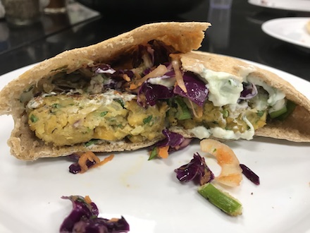 1 large cucumber, peeled, halved lengthwise, seeded, and shredded Salt and pepper 1 ½ cup plus 6 tablespoons 2-percent Greek yogurt 9 scallions, sliced thick ½ cup fresh cilantro, minced 2 ¼ cup canned chickpeas, rinsed 3 large eggs ¼ cup olive oil ¾ teaspoon garam masala ¼ teaspoon cayenne pepper 1 cup panko bread crumbs 3 shallots, minced Lime or lemon wedges for serving Pita for serving 1. Toss cucumber and ¾ teaspoon salt together and let drain in colander for 15 minutes. Combine drained cucumber, 1 ½ cup yogurt, 3 tablespoons scallions, and 3 tablespoons cilantro in bowl and season with salt and pepper to taste; set aside. 2. Mash by hand or pulse chickpeas in food processor to coarse puree with some large pieces remaining, 5-8 pulses, scraping down sides of bowl as needed. Do not over process— the texture helps the patties stick together and prevents mushiness. 3. In medium bowl, whisk egg, 2 tablespoons oil, garam masala, ¼ teaspoon salt, and cayenne together. Gently stir in panko, remaining scallions, remaining cilantro, and shallot until just combined. Divide bean mixture into 18 lightly packed balls and gently flatten each ball into 1-inch thick patty. 4. Heat remaining 2 tablespoons oil in nonstick skillet over medium heat until shimmering. Gently place patties in skillet and cook until well browned on first side, 4 to 5 minutes. Gently flip patties and continue to cook until well browned on second side, 4 to 5 minutes. 5. Serve by stuffing pitas with chickpea cakes, slaw, and cucumber yogurt sauce with lime or lemon wedges on the side. Coleslaw with Cilantro Lime DressingServes 6-9 as a side 1 small red cabbage, or a mix of red and green cabbage, sliced thinly 3 carrots, grated ½ onion, sliced thinly ¼ cup extra virgin olive oil 2 limes, juiced 2 T cilantro, minced ½ teaspoon cumin 1. In a large bowl, combine cabbage, carrots and onion. Toss to combine. 2. In a small bowl, whisk together lime juice, cilantro and cumin. Slowly add the olive oil while continuously whisking. Pour over cabbage mixture and combine thoroughly.