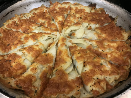 Crispy Potato Galette(Adapted from The New York Times)Serves 8 4 pounds baking potatoes, scrubbed clean and dried 1 clove garlic, minced ¼ cup extra virgin olive oil 1 tablespoon fresh rosemary or sage, finely chopped ½ cup grated sharp cheddar, parmesan Salt and pepper to taste 1. Preheat the oven to 450°F and grease the bottom of a 9-inch skillet with olive oil. 2. Combine garlic and olive oil in a small bowl and set aside. 3. In a food processor fitted with a 1-millimeter slicing blade or with a mandoline, thinly slice the potatoes. Cover the skillet bottom with a layer of potato slices, overlapping them. Brush the potatoes with some oil, sprinkle them with some of the herbs, and season them with salt and pepper. Repeat with the remaining potatoes, oil and rosemary. Top the potatoes evenly with cheese. 4. On the stove, heat the galette over medium-high heat until it begins to sizzle. Transfer the skillet to the middle of the oven, and bake the galette for 25 minutes, or until golden and the potatoes are tender. Cut into wedges and serve warm.