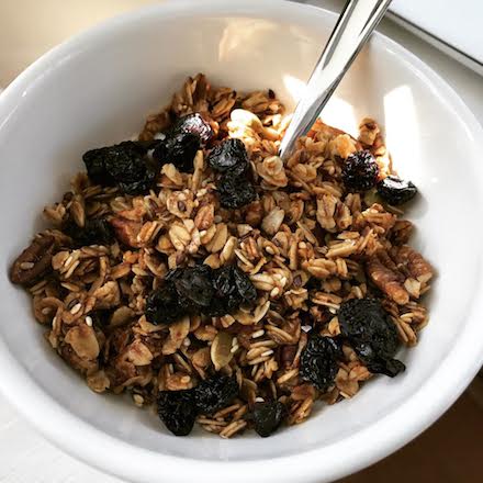 Granola is one of the easiest breakfasts to make at home and surprisingly more cost efficient than store-bought varieties. You can make a large batch and keep it in an airtight container for weeks. The best part is that you can adjust the baking time to suit your tastes — for a crunchier granola, bake for longer. If you like more clusters, you can add more honey and brown sugar. Our students love eating this granola over yogurt or a baked pear. Crunchy Cranberry GranolaYields about 5 cups 3 cups rolled oats 1/3 cup vegetable oil 1/4 cup light brown sugar 1/4 cup honey or maple syrup 1/4 cup sesame seeds 1/4 cup flax seeds 1/2 cup pumpkin seeds 1/4 teaspoon kosher salt 1 teaspoon vanilla extract 1/2 teaspoon cinnamon 1 cup dried cranberries 1. Preheat oven to 375˚F. 2. Over medium heat, combine oil, sugar and honey in a saucepan until sugar is dissolved. Add vanilla. 3. Combine oats, nuts, seeds, salt and cinnamon in a large bowl. 4. Add the liquid mixture to the oat mixture and combine. 5. Transfer oat mixture to a large baking sheet and spread evenly. 6. Bake for 25 minutes, stirring the oats occasionally. If you prefer chewier granola, or VERY crunchy granola, you can adjust the baking time. 7. Cool granola on a cooling rack until completely cool. Add dried fruit.