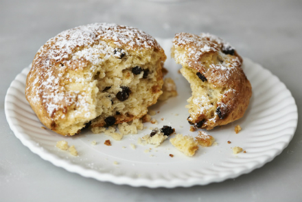 Currant Scones Yields 12 2-inch scones My husband Eddie loves these light-as-air scones, which are perfect for breakfast or a traditional afternoon tea. You can prepare and cut the dough in advance, storing them well wrapped in the freezer. When friends come for brunch you can impress them with fresh-from-the-oven scones. 3 cups all-purpose flour 2 tablespoons baking powder ¼ teaspoon salt ½ cup granulated sugar 8 tablespoons unsalted butter, chilled and cut in small cubes 2 large eggs (plus one for the glaze) ¾ cup cold cream ¼ cup dried currants 1. Preheat the oven to 350 degrees. Line a half sheet pan with parchment paper. 2. Combine the flour, baking powder, sugar and butter in the bowl of a stand mixer. Mix on slow speed with the paddle attachment until the dough is crumbly with small granular pieces of butter and flour. Mix in the currants. 3. In a small bowl whisk the cream and 2 eggs until combined. With the mixer on slow speed add this to the dry ingredients and mix just until the dough just comes together. Do not over mix. 4. Turn the dough out onto a lightly floured work surface. Sprinkle a little on top. Roll or press the dough out to a ¾-inch disc. 5. Using a 2-inch cutter dipped in flour (to prevent sticking), cut out the scones and place them on the parchment paper leaving about 1 inch between each scone. When you have finished cutting, gather up the scraps and gently press the dough out again and cut more scones. 6. Mix the egg with 1 tablespoon of water and lightly brush the tops. Sprinkle with a little sugar. 7. Place in the oven and bake about 20 minutes until golden brown. 8. Let cool and serve warm or at room temperature. Make-ahead hint: For fresh-from-the-oven scones you can prepare the recipe through step 5 and freeze. They will keep for one week. Continue from step 6 and serve. Scones pair well with Madeline's Grapefruit and Orange Marmalade.