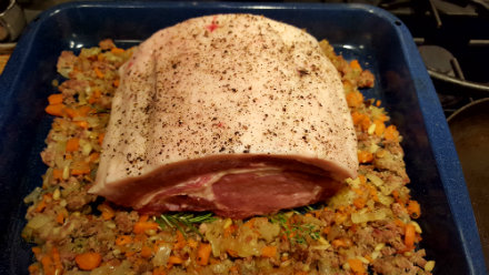 Last Saturday night I was supposed to make Jose Andres’ "Pork Roast with Fruit, Nut and Sausage Stuffing" — "supposed" being the operative word. Once I arrived at my client’s there was a change of plans. Apparently no one likes fruit paired with meats, a cooking methodology I worship. The rib-in pork roast, which should have been Frenched, exposing the ribs with a single chop per person, was laden with a fat back I had to cut away but there wasn’t the time nor the interest in Frenching the bone since there was only one roast for 9 people and 4 ribs in total. Now I was seriously vexed. I had a bone-in roast which was not going to be carved along the rib for single portions so stuffing it according to the recipe was also out of the question. What to do? I cut away some of the fat back and realized I could carve thin slices from this side before I hit the bone beneath. This was not going to give me the presentation I desired, but at least part of the problem was solved. Now for the recipe. The list of ingredients had winnowed down to pork roast and sausage. So I thought: a classic mirepoix in the bottom of the pan with the addition of garlic. Marsala, always a good idea with pork. And beef stock. Plus a handful of fresh rosemary, marjoram and chervil. (If you can’t find chervil, use Italian parsley and if there’s no fresh marjoram in the market, substitute thyme). I sautéed the carrots, onions, celery and garlic quickly, then added the sausage and partially cooked it. All of this went in a shallow roaster. I created a space in the center for the bed of herbs, then placed the roast on top of the herbs, fat side up. I massaged the roast with olive oil and created a fine crust of salt and pepper. Then I added broth and Marsala and placed it in a very hot oven on convection roast. An hour later the roast came out and I was able to carve away some servings for the juicy meat addicts and then put the remaining roast back in the oven for five minutes to finish off the cooking process.
