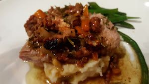 When it was time to serve, I did absolutely nothing to the “gravy.” It was superb. I simply removed the herbs and heated it up when it was time to plate. This is now one of my favorite ways to serve pork. My amendment to the recipe is: skip the bone-in roast and get a boneless pork roast, but see if you can get a good slab of fat on top because I am convinced that added an enormous amount of flavor to the final dish. And the next time the recipe you’re planning to follow doesn’t pan out for some reason, be creative, trust your instincts and remember, if it tastes good, no one will care anyway. Roast Pork with Sausage, Mirepoix and Marsala Gravy Serves 8-10 1 5-lb. boneless pork roast with an inch of fat 4 cloves garlic minced 2 carrots peeled and diced 2 stalks celery thinly sliced 1 medium onion diced 8 oz. Italian sausage removed from the casing 4 tbs. olive oil 3 cups beef stock 1 cup Marsala 1/3 cup roasted pine nuts 4 stalks fresh rosemary Handful of fresh chervil/thyme/marjoram/Italian parsley Preheat oven to 400 degrees convection bake. Add 2 tablespoons olive oil to a sauté pan. Over medium heat, sauté onions, celery, carrots and garlic for 4 minutes until wilted and translucent. Add raw sausage removed from the casing. Sauté for 4 additional minutes. Add salt and pepper to taste. In a shallow roasting pan add the sautéed vegetables and sausage.Clear a center space for the fresh herb bed. Place the roast on top. Rub with remaining 2 tablespoons olive oil. Salt and pepper liberally. Pour 2 cups broth and all of the Marsala around the pan. Place in the hot oven. Thirty minutes into cooking time, turn the pan and add the remaining cup of broth and some water if needed. After an hour insert a thermometer and look for an internal temperature of 140 degrees. Let roast 10 minutes before carving. Meanwhile, remove herbs from pan and reheat and reduce slightly on stovetop. Slice in ½-inch medallions. Serve on a bed of whipped potatoes. Ladle gravy over all.