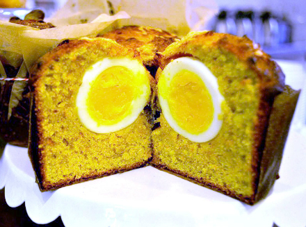This is a recipe I used to make at the bakery/coffee shop I was baking for in Brooklyn just before my husband and I left to move up to the beautiful northwest corner. I tried it a couple of times in the bakery once we took over, but I think it was a little too wacky for us back then — we were still transitioning from old owners, and I don't think it quite fit in with what we're doing. Now I bake corn muffins every morning and people absolutely love them, and I've been toying with the idea of trying this out again — it's such a great all-in-one breakfast, and people are always wowed by the concept the first time they see them. This is a different cornbread recipe than the one I make every day — it's a little thicker so that it will hold its own against the boiled eggs. —Audrey Leary, Blackberry River Baking Co.Egg in a Cornhole MuffinsMakes 6-8 large muffins 2 cups flour 2 cups cornmeal (I prefer to use a stone-ground one for some texture, but anything will work.) 1 1/3 cups sugar 1 tsp salt 1 tsp baking soda 2 cups sour cream 1 cup browned butter (I put butter in a cake pan and stick it in a pre-heating oven, then pull it out once it's browned and fragrant.) 4 eggs 6-8 boiled eggs (I like to aim for soft boiled so the yolk is still a little runny, but cook to your preference), cooled and peeled paprika, mustard powder, grated cheese and sea salt flakes (optional, to garnish) 1. In a large bowl, whisk together all the dry ingredients. Separately, mix together sour cream, browned butter and eggs — if the butter is still hot, mix it with the sour cream first so that the eggs don't scramble when you whisk them in. Fold the wet ingredients into the dry, stopping as soon as combined. 2. Get some jumbo muffin cups and a jumbo cupcake tin, or alternately (as we do at the bakery) some small pannetone molds. Drop a heaping spoonful of the corn batter in, about 1/3 of the way up the cup, and then place a hard-boiled egg on top, right in the middle. It helps if the egg has been toweled off so that it's very dry on the outside. Take another heaping spoonful of the cornbread batter and place it on top, using your fingers to push it down the sides of the egg and carefully covering the top of the egg. Repeat, then top all of the muffins with your choice of garnish (I use mustard powder and paprika for a little spice and color, grated Parmesan for a cheesy crunch and salt because, you know, salt.) Bake at 375 degrees for 15-20 minutes, until the muffins have risen, browned and feel firm to the touch. Cut them in half while still hot and enjoy! I served these with sriracha butter. They're also great for the next couple of days, grilled and buttered, and make an awesome breakfast on-the-go.