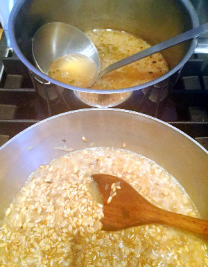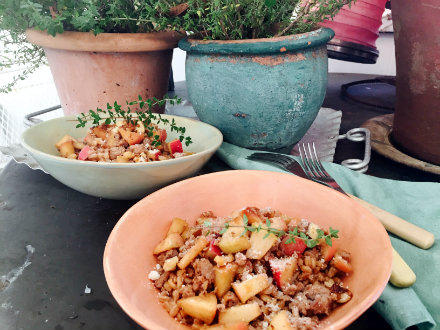 The chilly air is the best appetizer for warm and hearty food. This farrotto, made like a risotto topped with a belly-pleasing combination of apples, sausage and walnuts, will be just what you want for dinner when the temperature slides down. Farro, the Italian word for a grain that’s sometimes mistakenly called spelt or even wheatberries, is actually emmer in English. Because it’s a hulled wheat, farro absorbs liquid in the same way as rice. However, the grain is a bit thicker than rice so it absorbs slightly more liquid than rice does. I make a little more broth than I may actually use for the dish. I like to turn the flavoring ingredients into toppings that can be combined with the farro by the individual diners as desired. Farrotto with Apples, Sausage and WalnutsServes 4-6 Broth:1 tablespoon unsalted butter 1 tablespoon olive oil 1 full sprig fresh thyme 1 onion, finely chopped 7 cups water 1 cup dry white vermouth 1 teaspoon salt Farrotto:1 tablespoon unsalted butter 1 tablespoon olive oil 2 cups farro Topping:2 large sweet-tart apples such as Empire or Idared cut into ¼-inch pieces 4 links sweet Italian-style sausage, about ¾ pound, removed from their casings ½ cup chopped walnuts