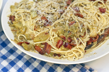 This week's recipe is from Berkshire-based duo The Butcher & The Baker. The Butcher is Jake, a nose-to-tail butcher/artist, who loves to cook and grew up in the woody hills of Western Massachusetts where his passion for local, fresh food was first instilled in him. The Baker is Silka, a designer/crafter who loves to bake and grew up in rural Western New York where her parents are candlestick makers. Together they spend most of their time talking about, shopping for, making, and eating food. By sourcing locally and sustainably, and spending time with the producers of their food, they’ve learned that every meal tells a story. In many ways the summer can feel like one long build-up to that first bright-red, juicy tomato from the garden. For months we spend warm evenings strolling through the garden, checking on the state of our staked fruit, patiently waiting for mid August. And then! We gorge — tomato sandwiches, caprese salad, salsa, fresh tomato sauce, grilled tomatoes, tomato and cucumber salad, canned tomatoes, tomato jam, you name it! But this summer we planted our seedlings a little late. So here we are, in late August with nothing but a few light-green orbs. Luckily — while nothing compares to that sweetly satisfying first bite of a big red — the truth is that there are plenty of delicious things to do with a green tomato. With a green tomato’s tart and firm flesh, there is a world beyond the classic fried side (not that there’s anything wrong with fried green tomatoes!). One popular option, seen often in kosher-style delis, is to go the pickle route. But in our house we like to do something else: green tomato sauce over pasta. Sauteed with onions, some cream, and bits of bacon (duh!), green tomatoes are the perfectly acidic base for a mid-summer-going-on-fall sauce.