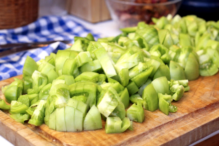 Fettuccine with Green Tomato Sauce 1 lb bacon, cut into small chunks 3 lbs green tomatoes, cut into small chunks 1 large onion, sliced ½ cup cream 1 lb fettuccine 1. Fry the bacon in a large saute pan. When done, remove bacon and set aside, reserving the bacon fat. 2. Saute the onions over medium-high heat until translucent. Add the tomatoes and cook for about one hour, or until the tomatoes are soft. Meanwhile boil water for pasta. 3. Cook the pasta and drain. Around this time, add the cream to the sauce and remove from heat. 4. In a serving bowl, pour the sauce over the pasta and sprinkle with bacon.