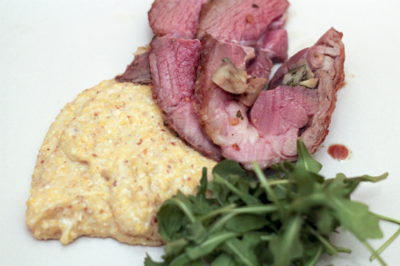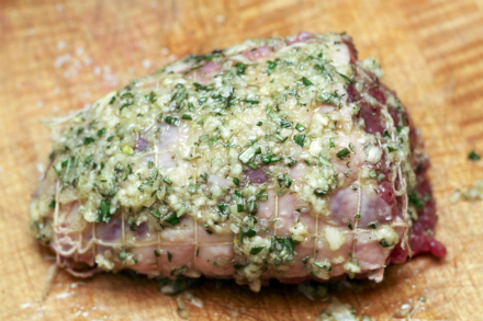 Garlicky Leg of Lamb 1 4-lb leg of lamb 2 small heads of garlic, minced (about 3-4 tbsp) 3 tbsp of diced rosemary 1 tbsp plus 1 tsp extra virgin olive oil 2 tbsp coarse sea salt 1. Let lamb come to room temperature and preheat oven to 350 degrees. 2. Mix the garlic, salt, olive oil and rosemary together to make a coarse paste. 3. Pat the lamb dry and cover with paste. 4. Place a heavy skillet over high heat. When skillet is hot, sear the lamb on all sides -- about two minutes a side. 5. Place the skillet in the oven and cook for about one hour, or until lamb is 120 degrees at its center. 6. Let rest for about 7 minutes before serving. Serves 3-4 people