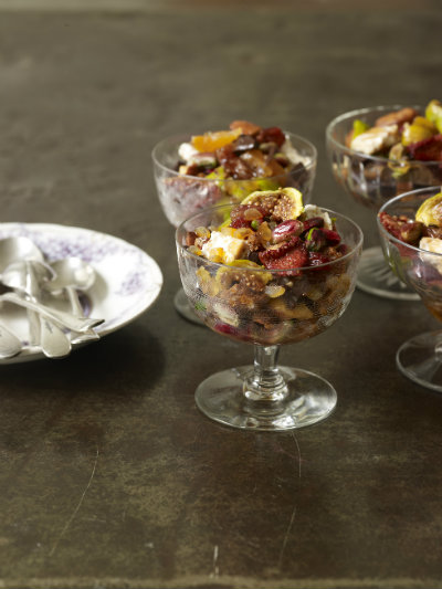 You are going to love this healthy dessert from Italy. Yes, dessert and healthy can be used in the same sentence! It’s a little like a deconstructed fruit cake--only scrumptious and strikingly pretty. In an air-tight container or Ziploc plastic bag, combine your favorite dried fruits, nuts, and any leftover candy and cookies you have on hand. When you want to serve a portion, add a splash of orange or apple juice and a diced pear and pass the spoons. You can even add a splash of rum or your favorite liqueur if you like. There are lots of ways to vary the flavor. Nut, Fruit & Sweets From Dolci: Italy’s Sweets (Stewart, Tabori & Chang) by Francine Segan Serves 10 A terrific no-cook, no-fuss dessert. 1 ½ cups assorted dried fruit, chopped 1 ½ cup assorted chopped nuts 2 to 3 cups assorted left-over candy bars, chopped 8 to 10 cookies, coarsely chopped Orange juice Optional add-ins: diced fresh pear, apple or other fruit. Rum, whiskey, or liqueurs like limoncello or amaretto Optional toppings: Yogurt or whipped cream In a Ziploc bag or plastic container with a lid, combine the dried fruit, nuts, candies, and cookies. Seal and reserve in a cool, dry place for up to 3 months. An hour before serving, put the amount you’ll need into a dish and stir in enough orange juice to moisten the mixture. If you like, add in fruit and a splash of booze. Serve topped with a dollop of yogurt or whipped cream.