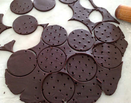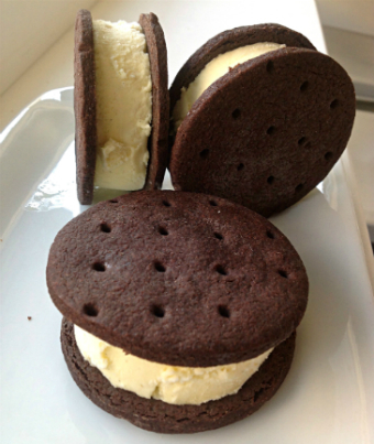 Chocolate Wafers12 oz. all-purpose flour 3 oz. cocoa powder 10 oz. butter 7 oz. sugar (softened) 3/4 tsp. salt 2 egg yolks 1 tblsp. vanilla Sift the flour and cocoa together into a bowl. Set aside. In a stand mixer with the paddle attachment, cream the butter and sugar. Add the salt. Add the yolks and beat until light. Add the vanilla. On low speed beat in the flour/cocoa mixture. Wrap the dough in plastic wrap. Refrigerate at least two hours or overnight . Preheat the oven to 350 degrees. Roll the dough out on a floured surface to about 1/8" thick. Cut out 16 three-inch circles and place on a parchment lined sheet pan. You can wrap the rest of the dough and freeze it. Bake for about 15 minutes until crisp. When the wafers are cool, put a scoop of ice cream on half the wafers. Place the other wafers on top and press down slightly to form sandwiches.