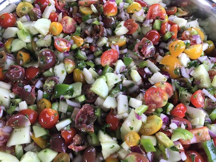We’re cruising into autumn, folks. Maybe you don’t want to admit it, and you grit your teeth jumping into lakes whispering to yourself, “yes, this is warm, I love this!” But even I know that the first turning maple leaves are not anomalies. They are, in fact, indicators of blazing reds and burnt oranges filling up our eyes as we blow warm air onto our stiff, cold fingers. On the farm, this is truly one of the most bountiful times of the year. The wash room is piled high with peppers, tomatoes, and watermelon that foreshadow the autumn colors as well. So what do we do with this bounty? This Israeli salad is a perfect meeting point between seasons. It showcases our summer heat-loving crops like tomatoes, bell peppers, and cucumbers, and makes use of some fast-growing fall crops, like that crunchy radish thriving again in cooler soil. These cool summer flavors meet the warmth of toasted cumin seeds, an intimation of cooler autumn meals to come. Israeli salad pairs well with most savory warm summer dishes, particularly those teaming with Middle Eastern flavors, like shakshuka or a chickpea stew. Israeli Salad Serves 4-6 1 red onion, diced 2 large cucumbers, peeled, deseeded and diced 3 large tomatoes or equivalent amount of cherry tomatoes, deseeded and diced 2 bell peppers, deseeded and diced 1 bunch radishes, thinly sliced ½ cup flat-leafed parsley, roughly chopped 2 lemons, juiced and zested 2 tablespoons red wine vinegar 2 cloves garlic, minced 2 teaspoons cumin seeds, toasted Salt and pepper In a large bowl, combine all of the diced vegetables. Add the remaining ingredients and toss to combine. Season with salt and pepper to taste.