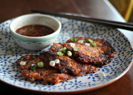 1. Drain the kimchi, reserving the juice. Get in there with your hands and squeeze out the liquid. Measure the juice and top off with water if needed to make 1 cup. Coarsely chop the kimchi and set aside. 2. In a large bowl, mix together the flours, salt, and kimchi juice. Let the mixture stand for 10 minutes, then stir in the chopped kimchi and scallions. 3. Heat a large skillet over medium-high heat with a tablespoon of oil. For each pancake, add about one-third cup of the mixture to the skillet and spread it out with the back of a spoon. Cook until the bottom is crispy and golden, about 2 minutes. Flip over and cook until the other side is crispy and golden, about 2 more minutes. Remove from skillet and drain on towels. Continue in batches. Serve the pancakes warm with a simple dipping sauce on the side. Here’s a recipe we really like, and it makes just enough sauce for one batch of pancakes. Dipping SauceCombine in a small bowl: 3 tablespoons soy sauce 1 tablespoon toasted sesame oil 1/2 teaspoon rice vinegar 2 teaspoons toasted sesame seeds, crushed or whole 1/2 teaspoon sugar or honey 1 clove garlic, crushed 1 scallion, chopped Both recipes adapted from TheKitchn.com