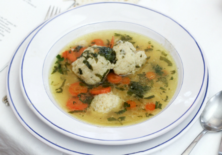 Matzoh Ball Soup 2 Tbsp. chopped parsley, plus more for garnish ½ tsp. ground ginger 6 Tbsp. of freshly melted schmaltz (rendered chicken fat) or olive oil salt and pepper to taste ¾ cup of sparkling water 1½ cups of matzoh meal 6 eggs, beaten 2 quarts of chicken stock 4 large carrots sliced into ¼-inch thick wheels 1. Stir parsley, ginger, salt, pepper into schmaltz. 2. Add eggs and sparkling water and beat to blend. Stir in matzoh meal. 3. Refrigerate for one hour. In the meantime, bring the chicken stock to a boil. 4. Wet hands and form chilled matzoh mixture into golf ball sized balls. Drop into boiling chicken stock, along with sliced carrots. 5. Reduce heat, cover, and simmer for 20 minutes or until balls float to top. Sprinkle with remaining parsley and serve.