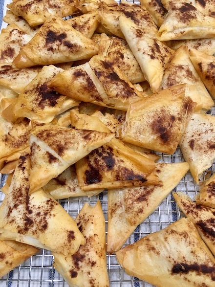 This is one of our favorite recipes at The Sylvia Center. It’s perfect for all ages and is a great handheld dessert for kids, not to mention a wonderful snack to make for a party. The phyllo dough is crispy and just slightly buttery and the tart apples match beautifully with honey. Replace the apple with pears or any other fruit, just be sure to cook down most of the liquid. You can also use this technique with savory fillings like spinach and feta or curried chickpeas. Mini Apple Turnovers Serves 6 3-4 large apples, peeled and diced 2 tablespoons honey 4 tablespoons butter Cinnamon, to taste 1 package phyllo dough, defrosted 1. Preheat oven to 400F. 2. Heat butter in a pan and melt slowly to avoid browning. Pour melted butter into a small bowl and add apples to pan. Sauté apples in the residual butter until soft. Add a pinch of cinnamon and the honey to the apple mixture to desired taste. 3. Following instructions on box for handling phyllo dough, fold dough in half lengthwise and brush surface with butter. Place ¼ cup apple mixture at bottom corner of the dough and fold into a triangle, and then continue to fold in triangles, like folding up a flag. 4. Brush each triangle with butter and place on a baking sheet. Bake 7-10 minutes or until golden brown.