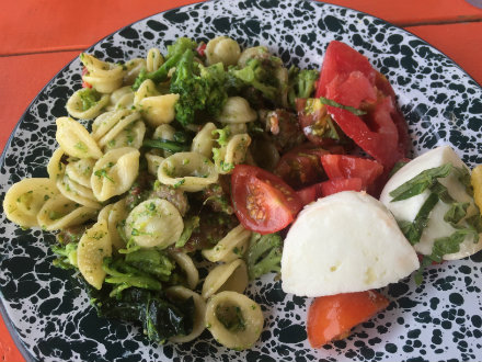 Never have I tasted a finer combination of broccoli and pasta than in this dish. The sweet and salty of the Italian sausage and the spiciness of the chili make it full of flavor and give it a nice kick too. As a bonus, it’s incredibly quick and easy to prepare and clean up. One might be tempted to add some fresh tomatoes, which we won’t totally discourage. However, the recipe stands alone so nicely, that we would instead encourage you to prepare a side dish of tomato salad or bruschetta made with heirloom tomatoes like Brandywine, Cherokee Purple or Upstate Oxheart, along with fresh mozzarella and Genovese basil. Enjoy September’s harvest! Orecchiette With Broccoli And Sausage Serves 5-6