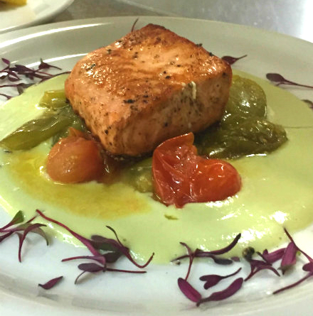 This recipe is the creation of Haven’s new executive chef, Matthew Schweitzer. Matt recently offered this delicious unique dish at Haven’s Valentine's dinner and was such a huge hit he put it on our Supper Club menu last month. This recipe has a few extra steps but is actually easy to re-create at home and well worth the effort. The flavors really sing here; tomatillos, coconut milk and avocado form a complex flavor profile that will leave your guests thinking you brought in your own private chef to cook for them. From our kitchen to yours — enjoy! Pan-seared Salmon with Tomatillo Tomato Salad and Coconut Avocado SauceServes 4 2 8-oz salmon fillets, skin on 8 tomatillos, cut in half 12 cherry tomatoes, cut in half 1 clove garlic 1 14-oz can organic coconut milk 1/4 cup vegetable stock 1 fresh avocado, pitted and skin removed 1/2 cup olive oil, more for baking Kosher salt and freshly ground pepper Micro greens for garnish (optional) For the Tomato Salad1. Position a rack in the center of the oven and heat the oven to 450 degrees. Lay the tomatoes and the garlic on a baking sheet. Drizzle with olive oil and season with salt and pepper. Bake for 15 minutes and set aside. Keep the oven on 450. For the Vinaigrette1. In a blender puree 4 tomatillo halves, 6 cherry tomato halves and the garlic. With the blender running, drizzle in the olive oil until emulsified. Season to taste with salt and pepper. Set aside. For the Avacado Sauce1. In a medium size saucepan, bring the vegetable stock to a boil. Add the coconut milk. Increase the heat to medium high and simmer until liquid is reduced by one quarter. Remove from heat and cool slightly. Add the avocado and puree. Set aside. For the Salmon1. Season the flesh side of the salmon with salt and pepper. 2. Coat the bottom of a 10" oven-safe sauté pan with a thin layer of olive oil. Heat the pan over medium high heat until whisps of smoke appear. Place the salmon in the pan skin side up. Remove from heat and place pan in the oven for three minutes. Remove from oven, flip salmon over skin side down, nestle the remaining tomatoes and tomatillos around the salmon and bake for three additional minutes. To ServeToss the warm tomatoes and tomatillos in the vinaigrette. Divide the sauce among four plates. Cut the salmon into four servings and place one on each of the sauced plates. Spoon the warm tomato salad off to one side of the salmon. Garnish with micro greens if using. Serve immediately.