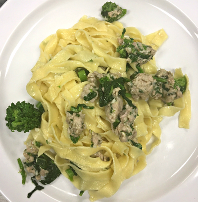 This recipe is so satisfying that before you’ve even finished cleaning your plate, you’ll be adding it to your repertoire of quick, easy and fulfilling weeknight meals. Preparing a mise en place — the French phrase for prepping everything you need for a recipe — will set you up for success by having all of the ingredients ready to go. Sautéing the broccoli rabe is arguably the best part of this recipe because it turns a mesmerizing bright green and comes to life before your eyes. That medium-high heat is a magical thing! When it came time for us to share the meal we created, it was evident from the silence and facial expressions that the broccoli rabe’s commanding bitterness challenged some of our teen’s taste buds. This opened up the age-old discussion of how our taste buds are always changing. One of the best things about cooking is that it gives us a space to try new things. Pasta with Homemade Chicken Sausage and Broccoli RabeServes 6 1 lb pasta 1 tablespoon extra virgin olive oil 1 lb ground chicken 2 tablespoons parsley, minced 1 teaspoon fennel seeds 1 teaspoon dried oregano 2 cloves garlic, minced 1 cup chicken broth, maybe more 1 bunch broccoli rabe, chopped into 1-inch pieces Grated Parmesan Salt and pepper Crushed red pepper flakes 1. Cook pasta according to instructions on the box (al dente). Drain and reserve ½ cup pasta water. 2. In a large bowl, combine ground chicken, parsley, fennel, and oregano. Add a few pinches of salt and pepper. Mix to combine and set aside. 3. Heat a large skillet to medium-high heat. Add a generous drizzle of olive oil and, when it shimmers, add garlic and crushed red pepper. Sauté garlic until fragrant, about 1-2 minutes. Add chicken mixture and sauté for about 4-5 minutes. Add broccoli rabe and continue to cook until broccoli turns a bright green. Add pasta and ½ cup of chicken broth, or more if necessary. If the pasta sauce needs thickening, add some reserved pasta water and simmer. Serve immediately with Parmesan.