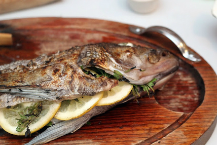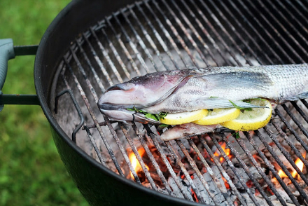 Perfectly Simple Grilled Whole Fish 1 whole fish, scaled and gutted. (Right now we like black sea bass and porgy.) handful fresh herbs (tarragon, parley, cilantro, chervil and dill are all good) 1 lemon, slice one half, leave the other half intact olive oil salt