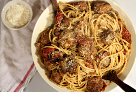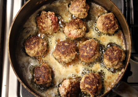 Make the meatballs:½ cup milk ½ cup bread crumbs 2 eggs 2 tbsp parmesan ½ lb veal ½ lb beef ½ lb hot Italian pork sausage 2 tbsp olive oil 2 tbsp butter 1. Combine milk and bread crumbs in a small bowl until the all of the milk is absorbed. 2. In a large bowl, use your hands to mix the three meats with the eggs, parmesan, and bread and milk mixture. Make sure it is well blended but don't over mix, as the meatballs will lose their fluffiness. 3. Place a large saute pan on high heat with the oil and butter. 4. Form the meat mixture into 1.5 – 2 inch rounds, and brown in small batches. Do not overcrowd pan. 5. Brown meatballs until they have a deep brown crusty exterior, a couple minutes on each side. One whole batch should take about 5-7 minutes – the balls don't need to be 100 percent cooked at this point. When done, put meatballs aside. Make the sauce:(2) 28 oz. cans of whole peeled tomatoes 2 medium yellow onions, chopped 6 cloves of garlic, peeled and chopped 1. Using the drippings from the meatballs, saute the onions and garlic in the same pan until translucent, about 5 minutes. 2. Add tomatoes, roughly crushing each tomato with your hand or a large wooden spoon. 3. Bring sauce to a boil and then turn the heat down to a simmer. Simmer for 45 minutes, stirring occasionally. 4. Add the meatballs back into the sauce and cook for another 15 minutes. 5. Pour over pasta or polenta and serve with some grated parmesan and pepper.