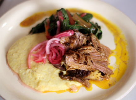 We've been reminiscing about this dish and decided to try our best to recreate the experience, taking advantage of all the great available citrus. Of course, we made a few substitutions to keep the meal as local as possible. Rather than buy tortillas, we served the pork over polenta, and we used a mix of U.S. organic Hamlin oranges and limes instead of the traditional Mexican sour orange. The pork came from Great Barrington's North Plain Farm, and the spices from El Punto De Encuentro Latin Market. And because it's winter and we don't have banana leaves, we tried to emulate the effect by doing a slow-and-low roast in a covered enamel pot. Puerco Pibil(serves 12) 5 tbs achiote seed 1 1/2 tbs dried Mexican oregano 1 1/2 black peppercorns 1 1/4 tsp cumin seeds 1/2 tsp whole cloves 6 inches of roughly 1/2-inch thick Mexican cinnamon (canela) or 1 1.2 tbs of ground cinnamon 1 tbs salt 14 garlic cloves, peeled 1/2 cup fresh oranges - 3 Hamlin oranges 1 cup fresh lime juice - 10 limes 12 lbs bone-in pork butt (can be split into two or three pieces) Pickled red onion 3 large red onions 1 1/3 cups fresh lime juice - 12 limes 2/3 fresh orange juice - 4 Hamlin oranges 1. Grind the spices together. You can use a spice grinder, a coffee grinder or a good old mortar and pestle – or just use preground spices and herbs. 2. In a blender, mix the spices, garlic and juice until the marinade has a slightly chalky texture between your fingers. 3. Place the meat in an enamel or cast iron pot and pour marinade over it. Cover and let sit in the refrigerator overnight. 4. Heat the ovenr to 200. Cook the pork, with marinate still on it, in the pot for at least 6 hours, or until it pulls apart easily. 5. While meat is cooking, slice onion thinly and place in a bowl. Bring a pot of water to a boil and pour over onions for 10 seconds, then drain. Place onions in a small bowl with juice and salt. 6. Take the meat out of the oven and shred. Serve with pickled onion and corn tortillas or polenta.