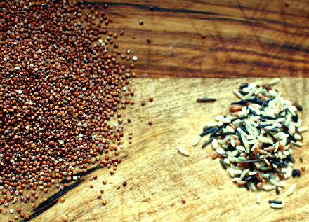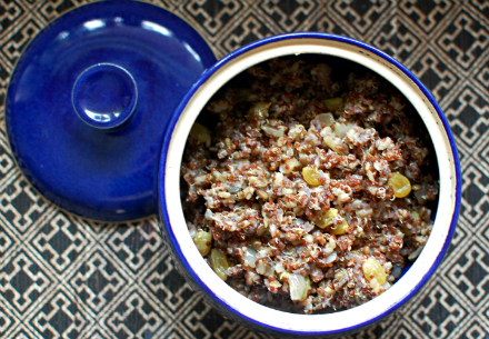 Quinoa with French Lentils, Wild Rice and Golden RaisinsAdapted from Louisa Shafia's The New Persian Kitchen Serves 6 ½ cup wild rice, rinsed ¼ cup French lentils, picked over and rinsed Salt 2 cups stock 1 cup quinoa, rinsed (I like to use red quinoa here) 1 medium yellow onion, diced 3 tablespoons ghee or grapeseed oil 2 cups golden raisins 2 tablespoons butter, room-temperature ½ teaspoon saffron, ground and steeped in 1 tablespoon hot water Freshly ground pepper 1. Fill a medium saucepan with at least 5 cups of water and bring to a boil. Add the wild rice, lentils and a ½ teaspoon salt. Bring back to a boil, then lower the heat and cover. Cook until the rice is tender, 45 to 50 minutes. Drain and set aside. 2. Meanwhile, bring the stock to a boil in a small saucepan. Add the quinoa and 1 teaspoon salt and bring the mixture back to a boil. Lower the heat, cover and simmer until the quinoa is tender, 25 to 30 minutes. Let it rest covered for 10 minutes off the heat, then fluff with a fork. 3. While the grains cook, heat the ghee in a skillet over medium heat. Add the onion and sauté until lightly browned, about 15 minutes. Add the raisins and cook for another 5 minutes. 4. Combine the rice, lentils, quinoa and onion mixture in a large bowl. Add the butter and saffron and toss gently to combine. Season to taste with salt and pepper.