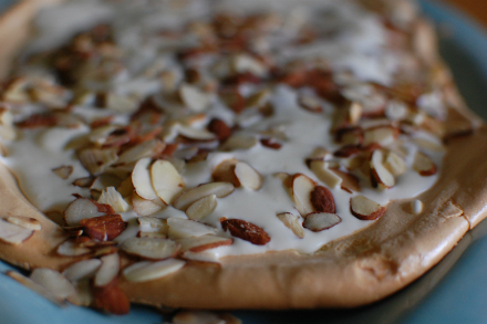 Rhubarb Meringue Serves 4 to 6 For the meringue:3 egg whites ½ cup granulated sugar pinch Kosher salt For the topping:2 cups chopped rhubarb 2 to 3 tablespoons sugar 3 tablespoons water the seeds of 1 vanilla bean ½ cup crème fraiche 1/3 cup toasted sliced almonds 1. Preheat the oven to 300°F, and line a baking sheet with parchment paper. Beat the egg whites in the bowl of a stand mixer until they’re white, foamy, and barely hold a soft peak, 3 to 4 minutes. Add the salt, and slowly add the sugar as the mixer runs. Keep beating until the mixture is white and glossy and not gritty to the touch, another 3 to 4 minutes. Spread the egg white mixture into a rough oval about ½ inch thick. Bake until golden and mostly hard to the touch, about 45 minutes. Remove from the oven and let cool slightly. 2. Meanwhile, make the topping. Combine the rhubarb, sugar, water, and vanilla bean seeds in a small saucepan. Bring to a low boil, stirring constantly to prevent sticking. Lower the heat to medium and continue to cook, stirring often, until the rhubarb breaks down and the mixture thickens, about 10 minutes. Remove from heat and let the mixture cool a bit. 3. Gently peel the meringue off the parchment. It might be a little sticky, and it might crack, but it’s okay—you’re going for total imperfection here. Lay the meringue on a serving plate and pour the rhubarb sauce overtop. Top with the crème fraiche hither and thither and pour the almonds over the whole mess of it. Cut into slices, or just put the plate in the center of the table and invite everyone to go for it.