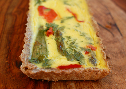 Smoked Salmon and Asparagus Yogurt Tart with Rye CrustFor the crust:4 ounces (a scant cup) rye flour 5 ounces (a heaping cup) all-purpose flour 1 teaspoon salt 1 teaspoon caraway seeds ¼ cup olive oil up to ½ cup water For the filling:5 to 6 spears asparagus olive oil salt 3 eggs ½ cup yogurt ½ cup heavy cream freshly ground pepper 2 ounces smoked salmon, torn into bite-sized pieces handful fresh herbs (parsley or dill are great here) 1. First prepare the crust: Combine the flours, salt, and caraway seeds in a medium mixing bowl. Add the olive oil and combine with a fork. Then add the water a few tablespoons at a time, and gently knead with your hand in the bowl, continuing to add water until the dough holds together. Gently roll out the crust on a floured surface and lift it into a greased 13 ¾ x 4 1/4-inch or equivalent tart pan. Transfer to the refrigerator. 2. Now, roast the asparagus. Preheat the oven to 425°F. Toss the asparagus with a glug of olive oil and a sprinkle of salt, and lay it on a baking sheet. Roast until tender and a bit browned, 12 to 14 minutes. Set aside to cool slightly. Reduce the oven temperature to 350°F. 3. While the asparagus cools, make the custard. Whisk together the eggs, yogurt, and cream, along with a pinch of salt and several grinds of pepper. 4. Remove the tart crust from the refrigerator and poke the bottom several times with a fork. Lay the asparagus in the crust. Tuck the smoked salmon around it. Top with the fresh herbs, and finally pour the custard overtop. Put the tart on a baking sheet and bake until firm, 30 to 35 minutes. Allow to cool for at least an hour before serving.