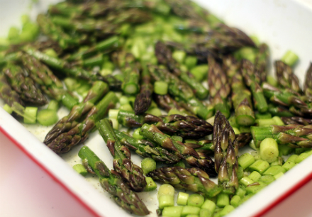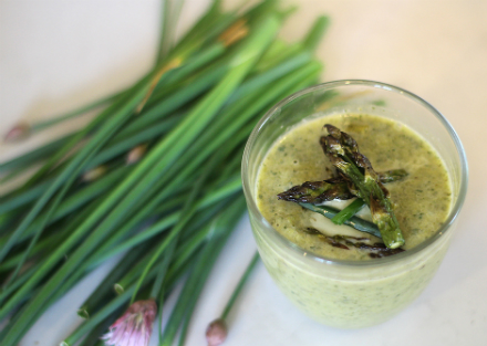 Spring Garden SoupServes 8 as a first course olive oil 2 lbs asparagus, tips removed and stalks chopped into 1" pieces 1/4 lb green garlic, cut into 1/4" rounds, green and white parts separated (if you can't get any, use an onion instead) 8 cups rich, homemade chicken stock 1/4 lb fresh sorrel leaves, sliced into slivers 1/4 lb stinging nettle leaves (if you can't get any, make up for it with more asparagus or sorrel) 1/2 cup minced chives 1 cup heavy cream 1. Saute the white part of the green garlic with some oil in a pot. 2. Pour in the chicken stock and simmer the asparagus in it for 10 minutes, or until tender. 3. Meanwhile, roast the asparagus tips and the green part of the green garlic in the oven at 350 degrees for 20 minutes. 4. Once the asparagus is tender, put the sorrel and stinging nettles into the stock. 5. Simmer for another 5 minutes, then add the cream and bring the soup to just short of a boil. 6. In a blender, or with an immersion blender, puree and let soup cool. 7. Serve in small bowls with a few chives, roasted asparagus tips, green garlic and a spoonful of goat's milk yogurt scattered over the top.