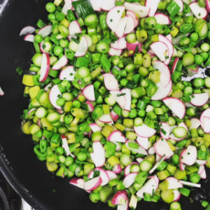Spring Grain SaladServes 4 1 cup cooked couscous 1 cup cooked wild rice ½ cup sweet peas, chopped into bite-sized pieces 1 bunch asparagus, chopped into bite-sized pieces 1 small bunch radishes, sliced thinly 3 scallions, sliced thinly ½ cup fresh mint, roughly chopped ¼ cup garlic chives or scapes, minced ¼ cup crumbled feta or other crumbly cheese like queso fresco or cotija Zest of 1 lemon ½ cup extra virgin olive oil 2 tablespoons lemon juice Salt and pepper to taste 1. Lightly saute the peas, asparagus and radishes over medium high heat for 2-3 minutes. 2. Toss together the couscous, rice, vegetable mixture, scallions, zest, and herbs until combined and set aside. 3. Whisk together the lemon juice and olive oil until emulsified. Drizzle over grain and vegetable mixture and toss to combine. 4. Season with salt and pepper and top with crumbled feta.