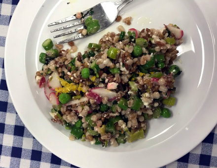 This spring grain salad says spring is here like the sounds of birds chirping in the morning! We love it so much that we made it five times last week! One of the best elements of this recipe is the opportunity to experiment with different grains. At The Sylvia Center, we always try to incorporate whole grains into our recipes. They give us the natural benefits of fiber, nutrients and flavor, whereas white grains are stripped of all of this good stuff when they're processed. In addition to couscous and wild rice, we added farro and wheat berries, which provide a delightful mixture of texture and color. As long as you keep in mind the different cooking times and keep the proportion of grains to vegetables, you can’t go wrong. We also can’t get enough of the tender spring vegetables and herbs in this dish. This time of year, asparagus and peas are so tender that young chefs can safely practice their dicing skills or easily break them into bite-sized pieces with their hands. Sliced into delicate discs, the radishes add a beautiful contrast of color. In the Katchkie Farm Learning Garden, we’re just starting to see our radishes and peas sprout, but our perennial chives are popping up like crazy and we aren’t afraid to put them in everything. They pull this dish together by adding a fresh spring flavor you can’t get from anything else.