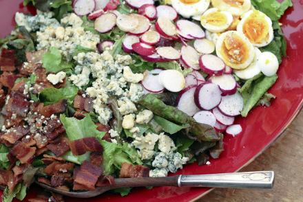 For the salad: 4 oz crumbly blue cheese or sharp cheddar 1/2 lb thick bacon, cut into chunks and fried 6 eggs, medium boiled and sliced 1 bunch radishes, sliced into rounds 2 heads romaine lettuce, ripped into reasonably forkable-sized pieces For the dressing: 2 oz blue cheese 1/2 cup red wine vinegar 2 tsp Worcestershire sauce 1 tsp Dijon mustard 1 clove garlic, crushed and minced 2/3 cup extra virgin olive oil 1. Prepare each of the individual ingredients for the salad. 2. In a large shallow serving platter lay down a bed of the lettuce. 3. Arrange the cheese, bacon, eggs, and radishes in rows over the bed of lettuce for a pretty display. 4. Whisk the dressing ingredients together and pour over the dressing. Serve with bread and butter.