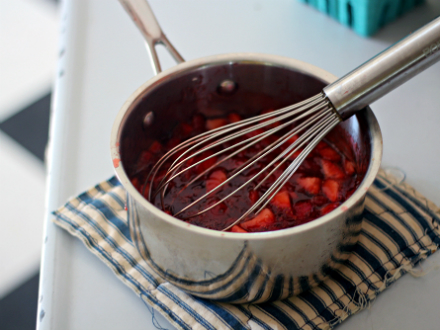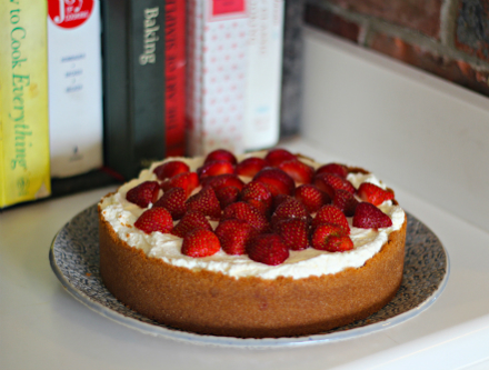 Crust:15 graham crackers (about 1 ½ cups when crushed) ¾ stick butter, melted 1/3 cup sugar 1 tsp salt Jam Layer:1 lb. strawberries, hulled 1/3 cup sugar 1 1/2 tablespoons cornstarch Mousse Layer:1 lb. strawberries, hulled 1/2 cup sugar 1/2 tbsp. lemon juice 1/2 tsp. salt 3 eggs, separated into yolks and whites 1 cup heavy cream 1-1/2 tsp. vanilla extract Whipped Cream:1 cup heavy cream 2 tbsp sugar To make the crust: Preheat oven to 350°. Crush the graham crackers. A food processor is the easiest way, but you can also put the crackers in a heavy zip-lock bag, wrap the bag in a dishtowel, and whack away at it with a rolling pin. Mix all crust ingredients until well-combined. Dump into a buttered 9-inch pie pan or spring-form pan and press firmly onto the bottom and up the sides. (If using a spring-form pan, lay parchment paper in the bottom and then butter.) Bake for 10 minutes. Set pan on wire rack to cool.