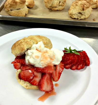 Strawberry ShortcakeServes 8-10 1 Pint ripe strawberries, washed and quartered 1/4 Cup fresh orange juice 4 Cups all-purpose flour 1/2 Cup sugar 2 Tbsp baking powder Pinch (1/16 tsp) kosher salt 1/2 Cup cold butter (1 stick), cut into chunks 1 Cup well-shaken buttermilk 1/2 Cup milk 1/2 Cup cream, plus more for brushing Finely grated zest from one lemon 1. Preheat oven to 400°F. Macerate the strawberries in the orange juice. Set aside. (Macerate means to let the berries soak and soften in the liquid). 2. In a large bowl, sift together flour, sugar, baking powder and salt. Use a pastry cutter or fork to blend in butter until mixture resembles coarse meal. 3. In a medium bowl, whisk together buttermilk and milk, then whisk in lemon zest. Add liquid mixture to dry mixture, stirring with fork just until dough forms. 4. Turn dough out onto a floured work surface and knead gently just until dough holds together, about 10 turns. Place dough on plate, cover with plastic wrap, and refrigerate until well chilled, at least 30 minutes. 5. On floured work surface, pat out dough to 1/2-inch-thick round. Using a 3-inch cutter, cut out biscuits. Transfer to an ungreased baking sheet. Bake until golden brown, 15 to 18 minutes, then transfer to rack to cool. 6. Whip cream until foamy. 7. Split the biscuits as you would an English muffin. Place on a plate. Spoon some berries and juice over the bottoms, top with whipped cream and replace the biscuit tops.