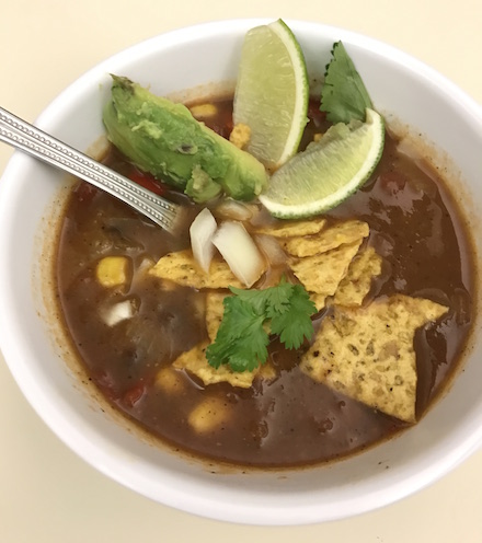 This vegetarian tortilla soup is simple, delicious and a great recipe to customize. It’s a wonderful starter or a nourishing light main course. Add more adobo or hot sauce if you like it spicy, or add more vegetables and beans for a heartier soup. The kids in our cooking classes love garnishing their own bowls of soup with their favorite toppings, which include avocado, extra adobo and, of course, chips! Vegetarian Tortilla Soup Serves 6 1 large onion, diced 1 red bell pepper, cut into 1/2-inch pieces 3 large garlic cloves, minced 2 tablespoons olive oil 2 tablespoon chili powder 1½ teaspoons ground cumin 1 teaspoon sugar 1 28-ounce can diced tomatoes, with juice 1 chipotle pepper in adobo sauce, finely minced, plus more for heat 1 cup frozen corn 1 15-ounce can black beans, rinsed 1 quart vegetable or chicken stock Salt and pepper to taste Garnish suggestions:Lime wedges Shredded cheese Fresh cilantro, chopped Red onion, diced Tortilla chips Ripe avocado, cubed Hot sauce 1. Warm a large pot over medium heat. Add oil, garlic, onion, pepper, and a pinch each of salt and pepper, and stir. Cook for 3-4 minutes, stirring frequently, until onions are translucent and the peppers begin to soften. 2. Add cumin and chili powder and stir to coat. Then add canned tomato, vegetable stock, chipotle pepper and sugar. Stir to combine and bring to a boil. 3. Once soup boils, add black beans and corn and stir. Reduce heat to low and simmer, covered, for 30 minutes or more, stirring occasionally. 4. Serve as-is or with recommended serving options above.