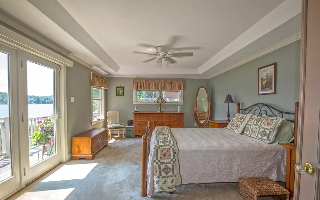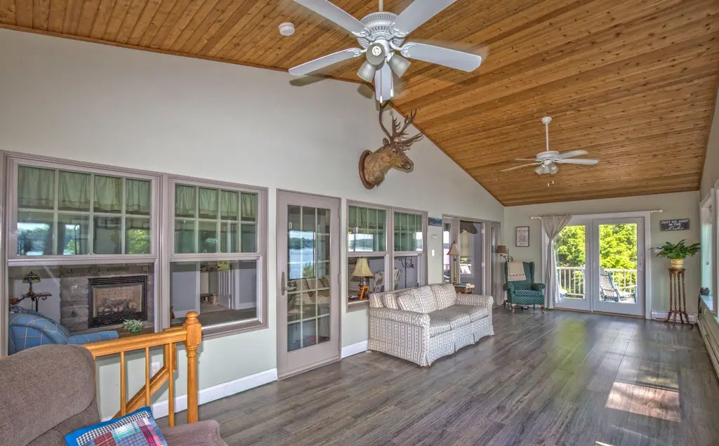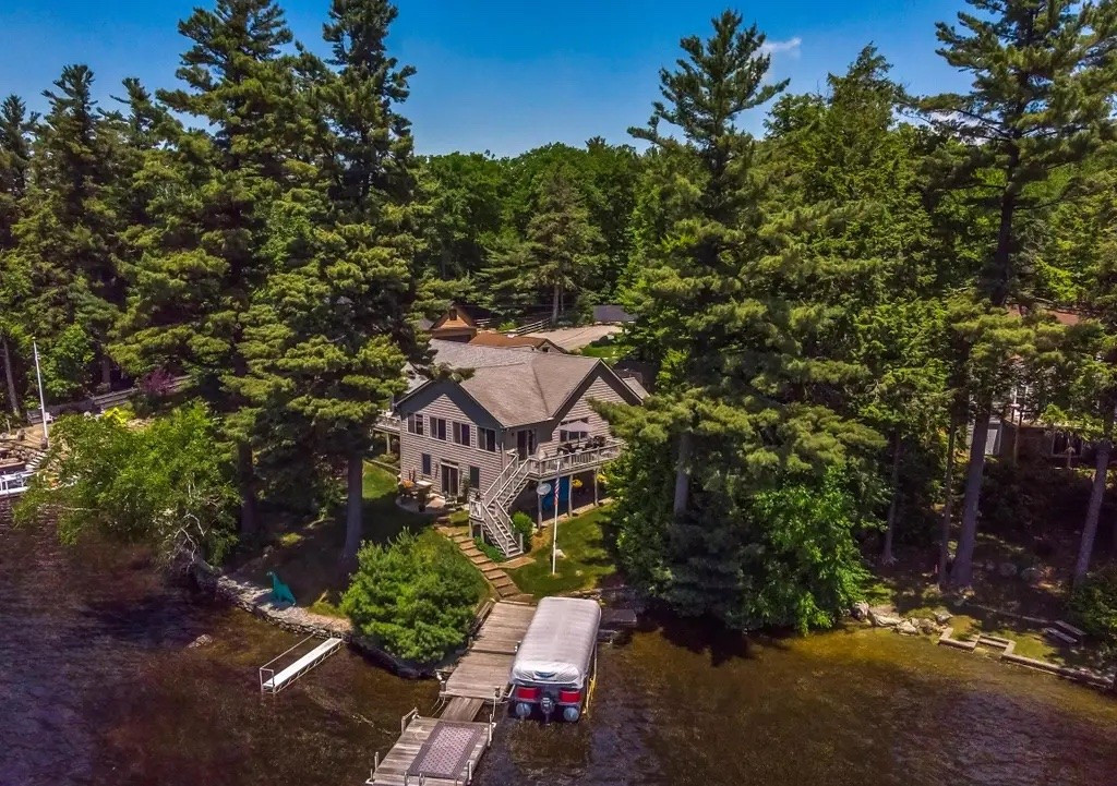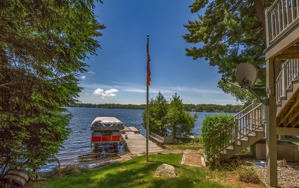 Built in 2011, this Contemporary in Otis sits on 147 feet of exclusive frontage on the reservoir and offers sunset views. It has three bedrooms and three bathrooms, a fireplace, furnished basement, and a four-car garage. And, of course, a dock, plus multiple decks, gardens and a hot tub. Listed at $1,900,000 by Coldwell Banker.
