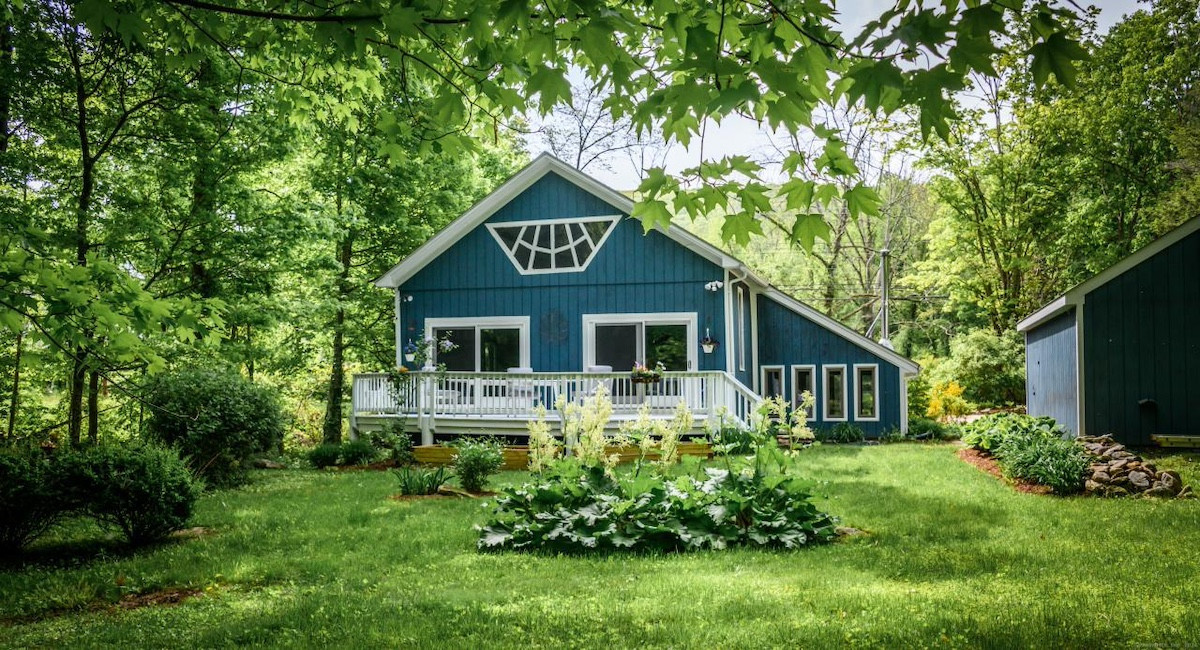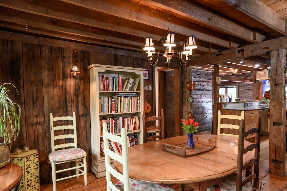 In Kent, the restored post-and-beam-structure includes the study with custom bookcases and wood stove. The kitchen blends granite and butcher block counters with high-end appliances. There are three bedrooms and three bathrooms with the option to use the primary suite as a separate in-law suite with a private entrance. Outside are lush gardens and a brook. Listed at $499,900 by Bain Real Estate.