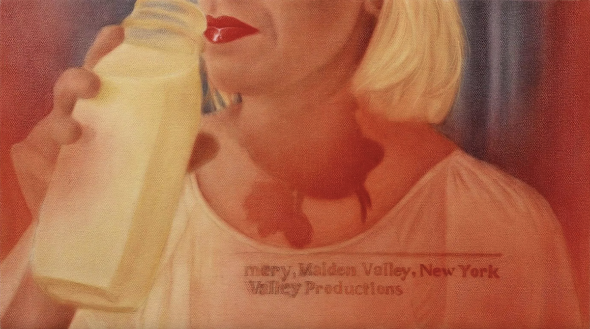 From bouncy primavera to sultry summer, we behold Kevin Mosca’s cinematically inspired, milk-soaked series of crimson-hued fantasy paintings arranged in a grid. This body of work teases out a nonlinear narrative around a milkman protagonist (we never actually see him) in the fictional town of Maiden Valley (where milky dreams flow). Mosca’s Maiden Valley Cream (2024) sets the stage with a vision of the commercial design for this faux brand, while Lay Me Down (2025) features the milkman’s worn hat at the end of a workday.