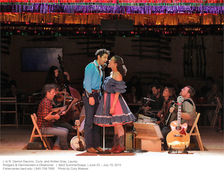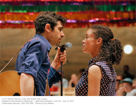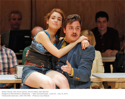 By Dan Shaw Everything is up to date at Bard Summerscape, where director Daniel Fish has gone as far as he can go in reimagining Rodgers and Hammerstein’s Oklahoma! (which opened on Broadway in 1943), transforming it into an edgy, immersive and sexy musical. If you’ve seen Oklahoma! performed at junior high schools, colleges, community theaters and on Broadway (as I have), you will be awed by how the familiar feels as fresh as the just-shucked corn piled on the set as you take your seat at one of the long picnic-style tables that ring the stage in two tiers. Scenic designer Laura Jellinek has transformed the black box LUMA Theater into a rustic setting made of plywood with a tinge of the Brooklyn hipster DIY aesthetic. The accomplished actors and new musical arrangements give the production a thoroughly contemporary attitude. You know this production is like “a bright golden haze on the meadow" when the swarthy Damon Daunno (who plays Curly) opens the show with a bluesy rendition of “Oh, What a Beautiful Mornin" that he performs with the swagger of the young Elvis Presley.