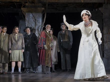 By Dan Shaw Without baring her famous legs or a single high-step, Chita Rivera razzle-dazzles us in Williamstown Theatre Festival’s production of Kander & Ebb’s The Visit. As Claire Zachanassian, the richest women in the world who has returned to the small, down-on-its-luck European village where she grew up, Rivera is perfectly cast as the formidable grande dame who seeks revenge on the man who deflowered and disappointed her when she was 17. As soon as you take your seat in the ’62 Center, Bruce Pask’s haunting set transports you to a small town in Europe that’s obviously on the brink of collapse. The glass is cracked in the roof of a once grand public space — perhaps the train station or central market — and the columns are overgrown with vines. There is a profound sense of desperation. The villagers make it clear in the opening numbers that they have become permanently disillusioned but are suddenly optimistic by the prospect of the billionaire Claire Zachanassian returning home. The possibility that she will save them is the only good news they’ve heard in years.
