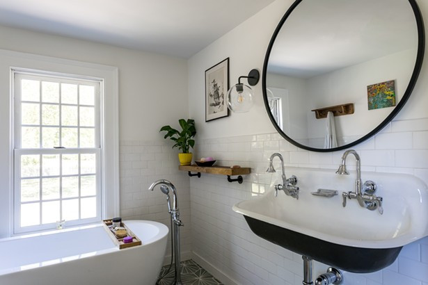 Much of the home's upstairs was spared from water damage but the bathrooms throughout the home needed an update. Working with Donaire, the Reisfelds redesigned the primary bathroom as a haven with a view to the back yard. An oversized freestanding tub sits at one end with the window at eye-level for bathers. Donaire chose tiles for the space and came up with the idea of adding floating wood slabs to the walls and matching them with a rectangular sink.
