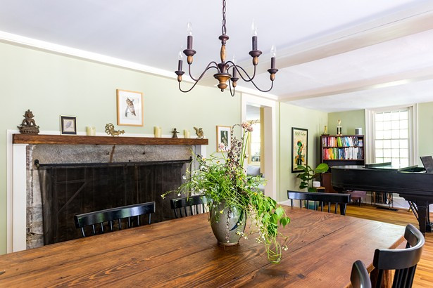 Central to the home's first floor, a giant fireplace faces three different rooms, including the living room, a sitting room, and a small parlor. The home's original rectangular living room — large enough for a baby grand piano at one end — was left untouched by the flood and features the home's original wood beams along the ceiling and the wide-plank "king's boards" along the walls — so called because they were culled from the widest, straightest trees and meant to be sent back to England to become the masts of navy ships.