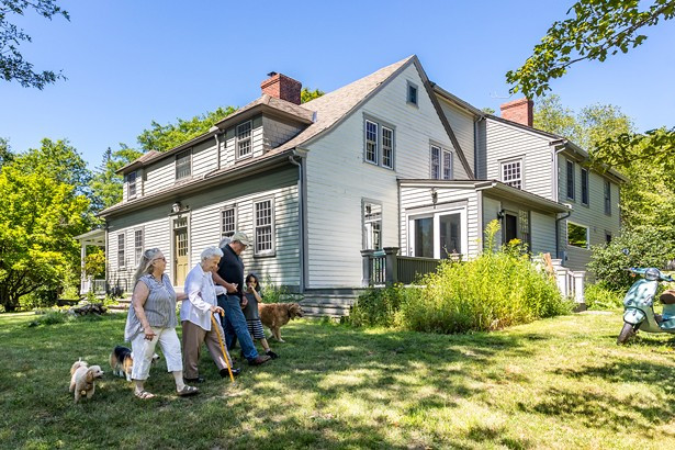 Neighbors, and now friends, take a walk around the historic property. From left to right is Sharon Stanfield; the home’s former owner Josephine Elling; her sons Steve and John Elling; and Elling’s great-grandson, Elden Ellrichs. “I didn’t want a new house,” explains Josephine Elling of her time owning the property. “I wanted an old house with memories in it, and to leave my own memories there.” Also with them are Stanfield’s bichon-poodle Sam, the Reisfeld’s golden retriever Beatrice, and Taco.