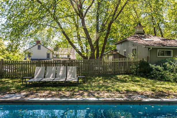 The homeowner between the Reisfelds and the Ellings installed a pool on a hill above the home. To the left is the back of the property’s original one-room school house, now Sharon Stanfield’s cottage. Previous owners had expanded the original structure at the back. The family transformed those spaces into a small working kitchen, bathroom, and bedroom and added a woodstove for heat as well as insulation. They also repaired a crumbling front porch and added screens.