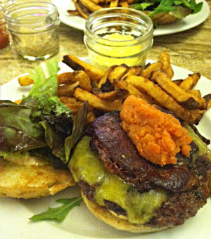 I've always been a big fan of buns (all kinds). But since I've gone gluten-free, my burger options have been severely limited unless I want to order one sans bun. But that's no fun, and not very filling, either. That's why I was “over the moon" to find out that Public in North Adams was serving burgers with a gluten-free bun option. They offer four kinds of burger, but my favorite is their BBQ version with house bbq sauce, cheddar, onion rings, and bacon, served with fries and a pickle (11.90 + 1.50 for the g.f. bun). You can also add a fried egg to any burger for an additional $1.50, but the BBQ burger is enough for me, what with the huge, sweet fried onion ring that comes on top of it. Be sure to let them know if you are severely gluten intolerant, though, as the fries and onion ring might not be a good bet for you if you are. -- Amy KrzanikPublic Eat + Drink34 Holden Street North Adams, MA (413) 664-4444 Related story: Getting Comfy in PUBLICThe Marketplace Café