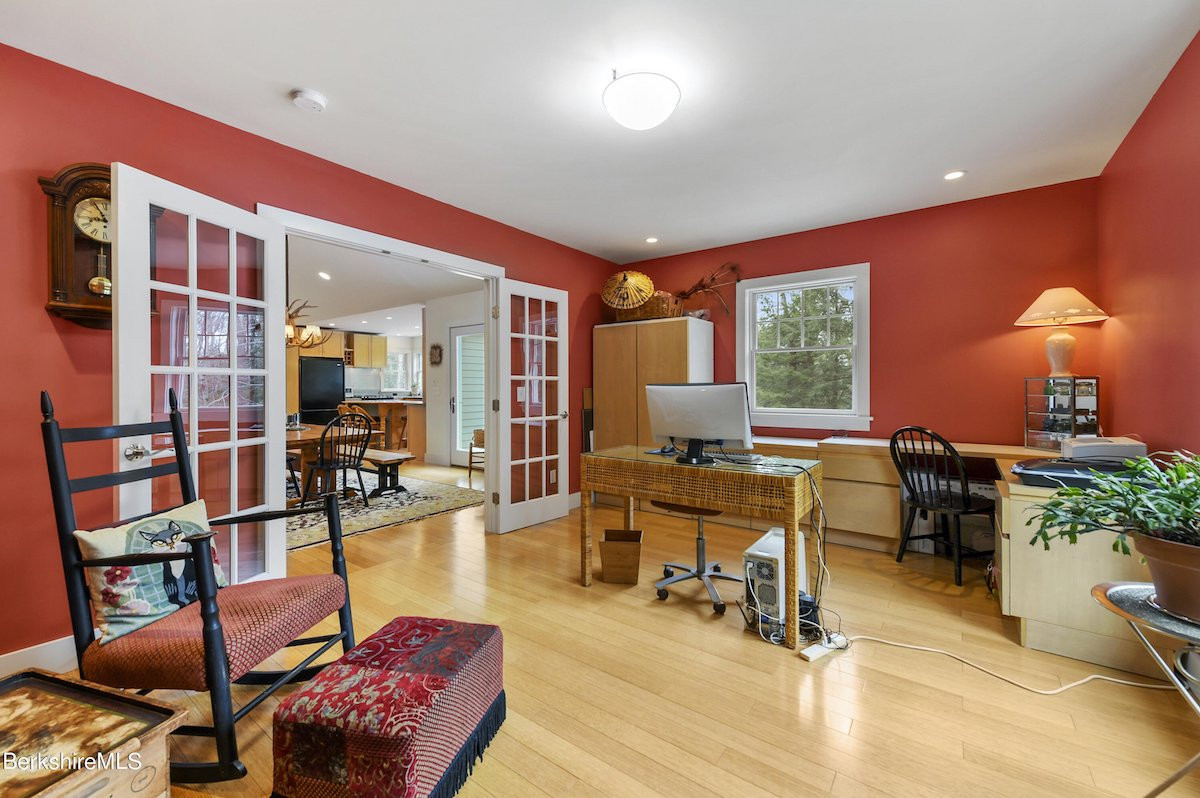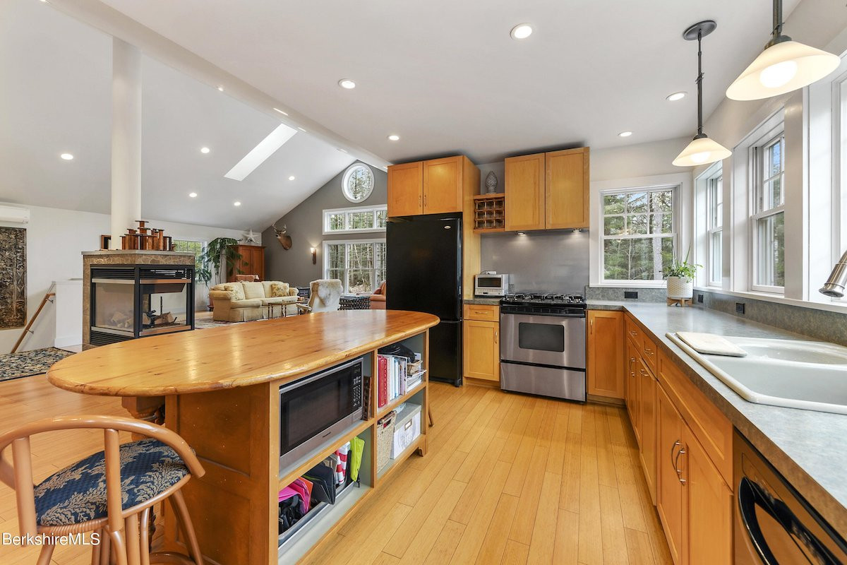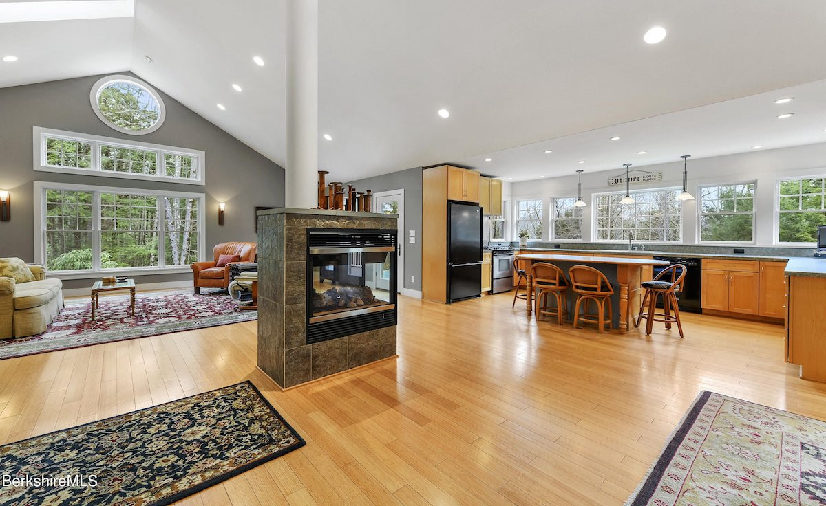 So well maintained it looks brand new, this Contemporary home in Otis offers a kitchen with a full length of windows looking out to treetops, and an open living floor plan. There are three bedrooms and three bathrooms, two decks, an oversized two-car garage and a shed. The landscaping includes perennial gardens and a firepit. Listed at $875,000 by Housatonic Real Estate.
