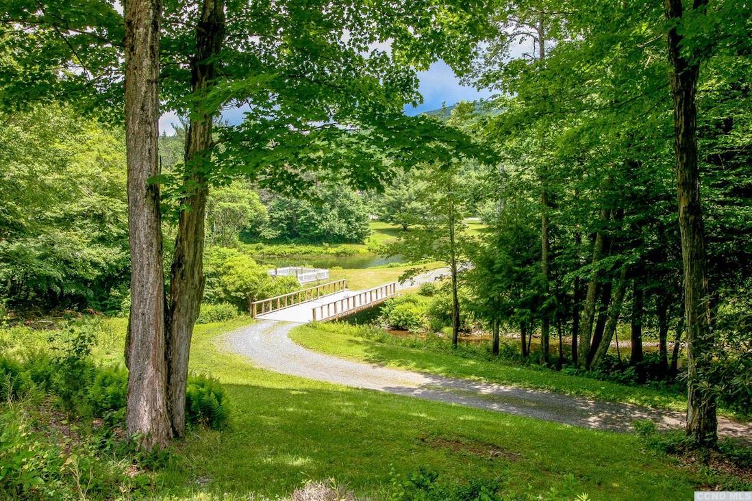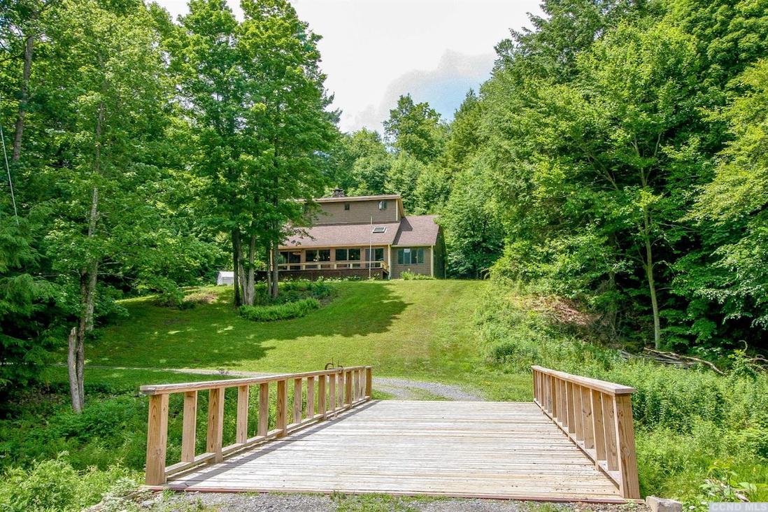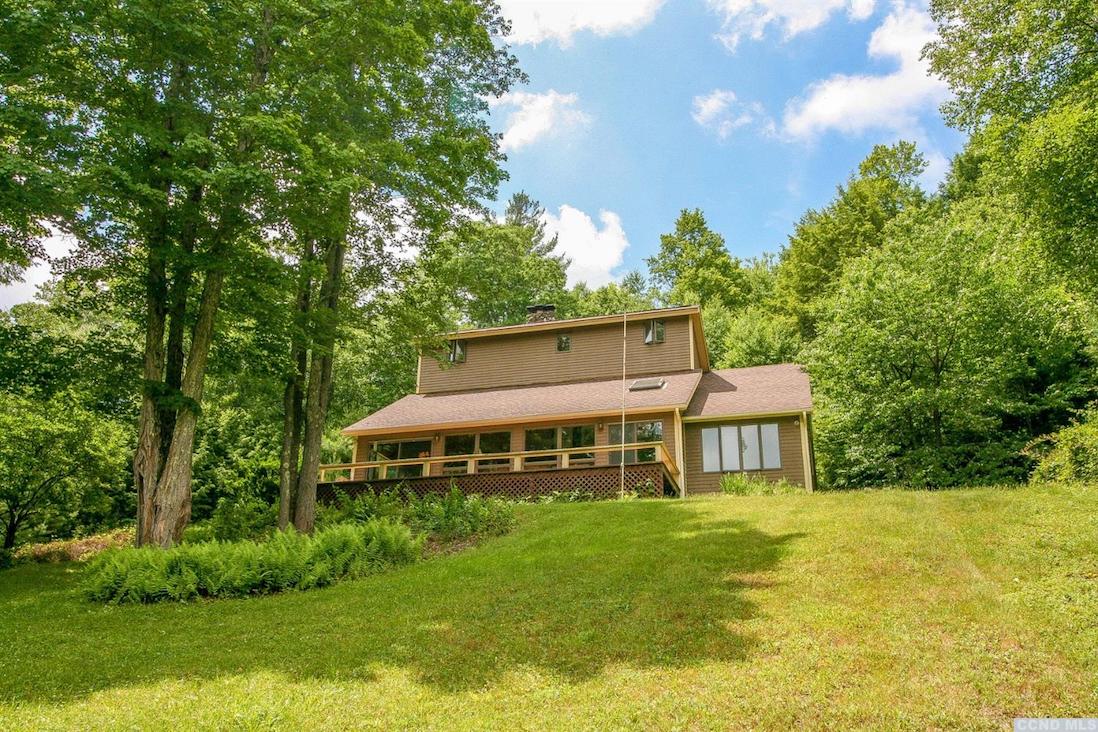 This contemporary home is set way back into the hill in Austerlitz on 24 acres along the Green River. Taking advantage of the site, the property includes bridges and hiking trails. There are five bedrooms and three bathrooms, a new kitchen, pine floors, and mountain views. There's also a raised-bed garden. It's close to Chatham and Great Barrington. Listed at $699,000 by Beach & Bartolo.