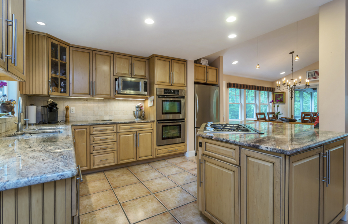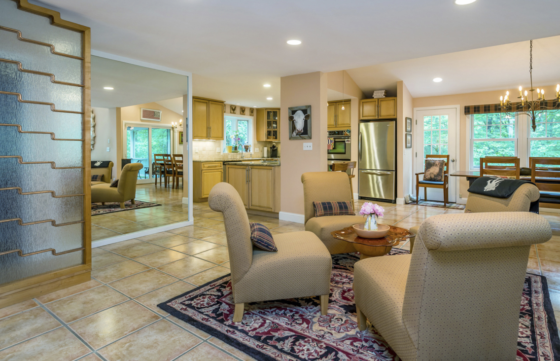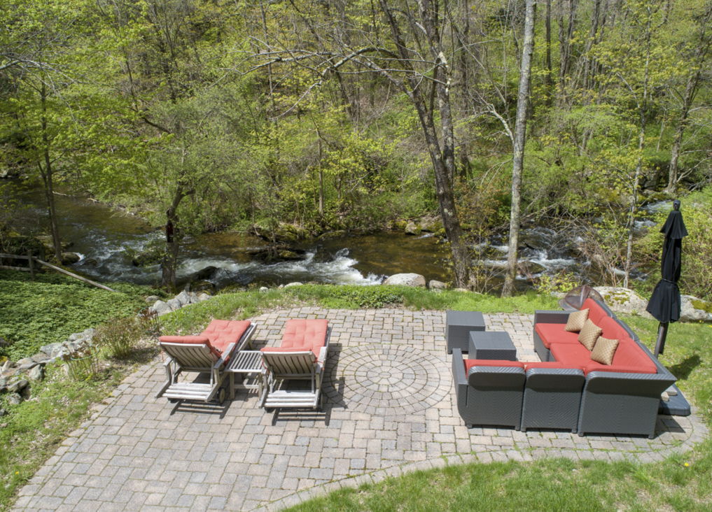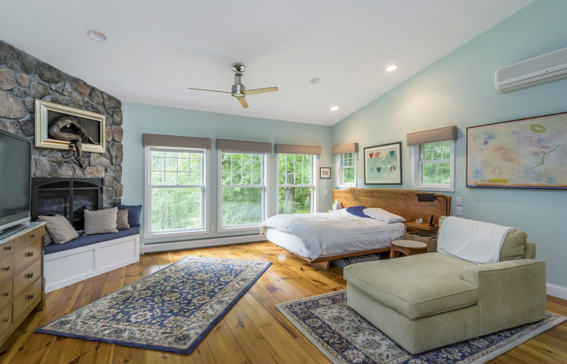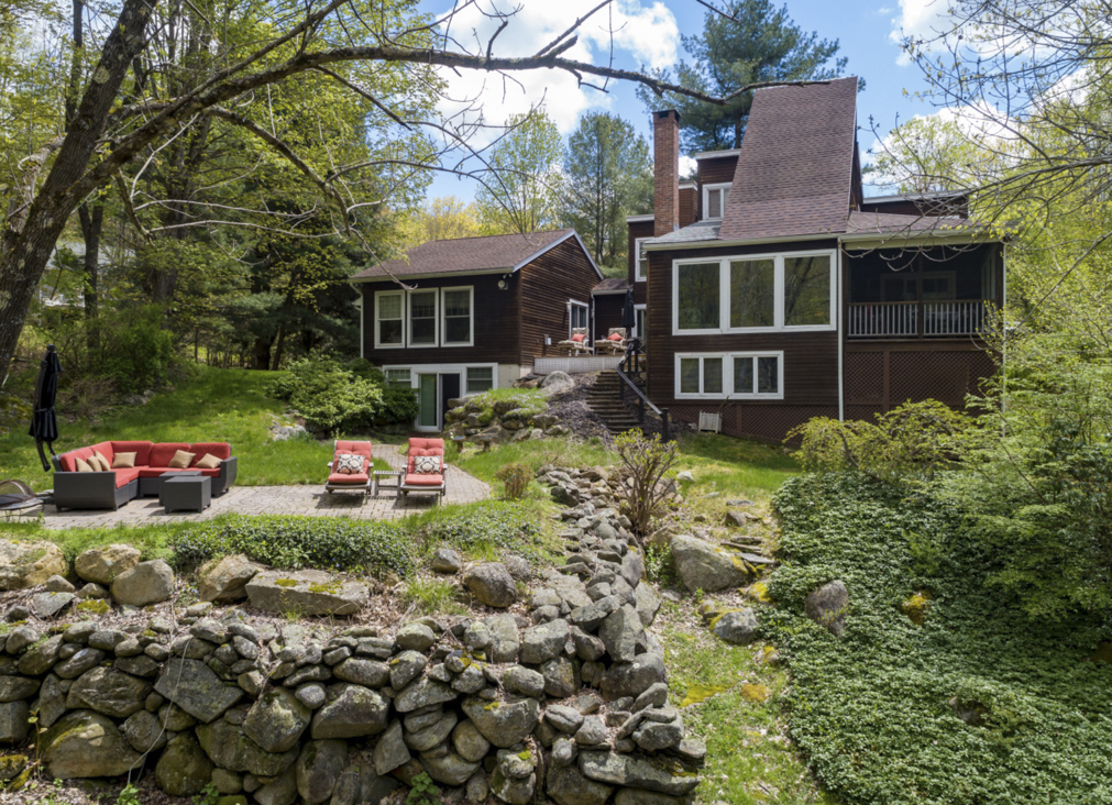This riverfront property in Goshen was built in 1981. It has four bedrooms and three-and-a-half bathrooms, a large kitchen that opens into the dining room, and a tiled great room with a stone fireplace. The master bedroom suite is on the main floor and has river views, a stone fireplace, private courtyard, and a tiled master bathroom. The home also features decks, patios, gardens, and sits just above the Marshepaug River. Listed for $799,000 by Sotheby’s International Realty.